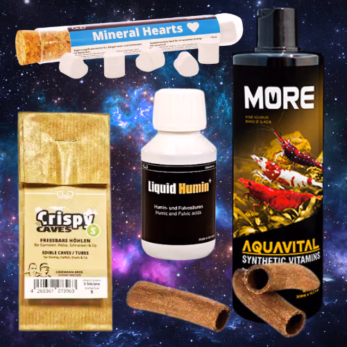Après l’arrivée, une autre phase critique commence. Il s’agit de la période des premières mues post-acclimatation. Or, une crevette affaiblie est particulièrement sensible à un manque de minéraux. C’est pourquoi une diffusion progressive est préférable à un apport brutal. Les Mineral Hearts ont justement été conçus dans cette optique. Ils diffusent lentement calcium, magnésium et oligo-éléments essentiels.